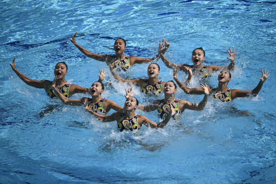 乌克兰队接下来出场,最终得到了95.1667分,总得分188.6080分获得第四名。中国队第7个出场,阵容为黄雪辰、孙文雁、呙俐、顾笑、梁馨枰、汤梦妮、尹成昕、曾珍、李晓璐。中国队的节目主题是《寻龙》,配乐是原创音乐。入水后先做了一个精彩的抛接,随后是两两配合的拱门式造型,然后是四人一组配合的托举,两个上面人做劈叉倒立,水位很高,造型新颖别致。几组韵律动作交替进行,令人眼花缭乱,接下来是高位托举、倒立上旋、下旋及精彩的双人抛接。这套节目编排难度大、造型别致、难度腿水位高,同步性好,最终得到97.3667分(完成分29.1000分,艺术印象分39.0667分,难度分29.2000分),总成绩192.9841分。