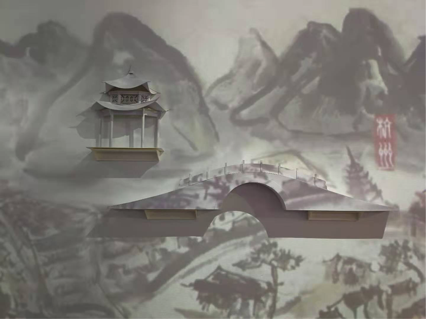 展览的第二个板块——纸艺大运河全景,就以非遗纸艺及其综合应用形成的立体纸艺模型,结合声、光、电手段,全景展现大运河宏伟的河道、沿岸主要标志性建筑、历史人文场景。观众可以看到由“纸铺”出品的《大运河纸艺影像装置》。它再现了大运河全河段22处经典自然人文景观。从南端的宁波鼓楼、余姚通济桥、绍兴八字桥,到中段的淮安榷关、南旺分水龙王庙、聊城船闸,再到北端北京地域内的张家湾、八里桥、南新仓、万寿寺、白浮泉。