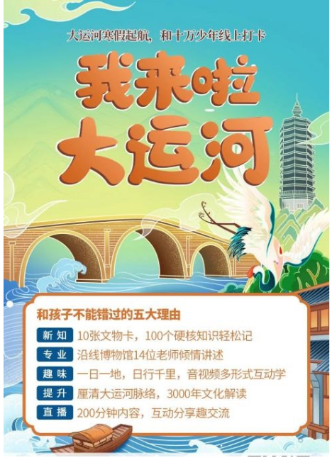 “我来啦!大运河——寒假公益线上打卡学习营”为孩子呈现千年运河的古今巨变及运河城市的风貌变迁,参与的博物馆有中国京杭大运河博物馆、宁波博物院、嘉兴博物馆、镇江博物馆、中国漕运博物馆、徐州博物馆、中国运河文化博物馆、沧州博物馆、通州博物馆、元明清天妃宫遗址博物馆、北京郭守敬纪念馆。