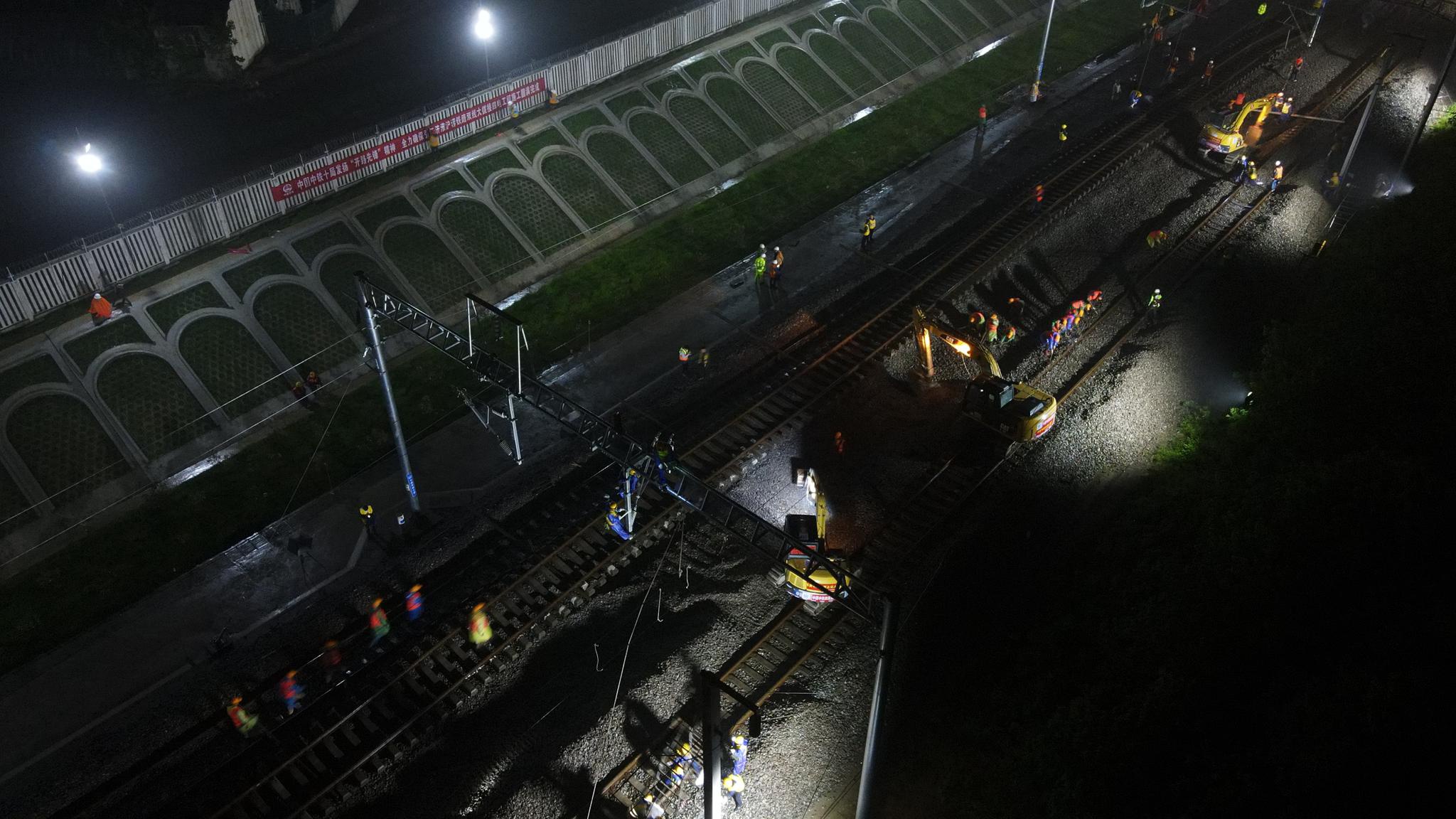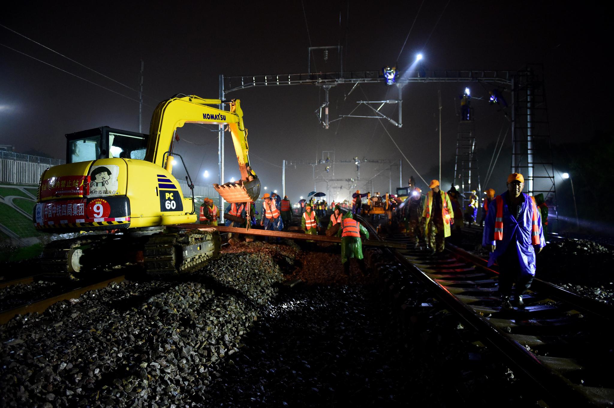 据施工方介绍,这是国内高铁建设史上首条双线拨接的高速铁路。施工需要避开列车运行时间,只能在晚上进行。